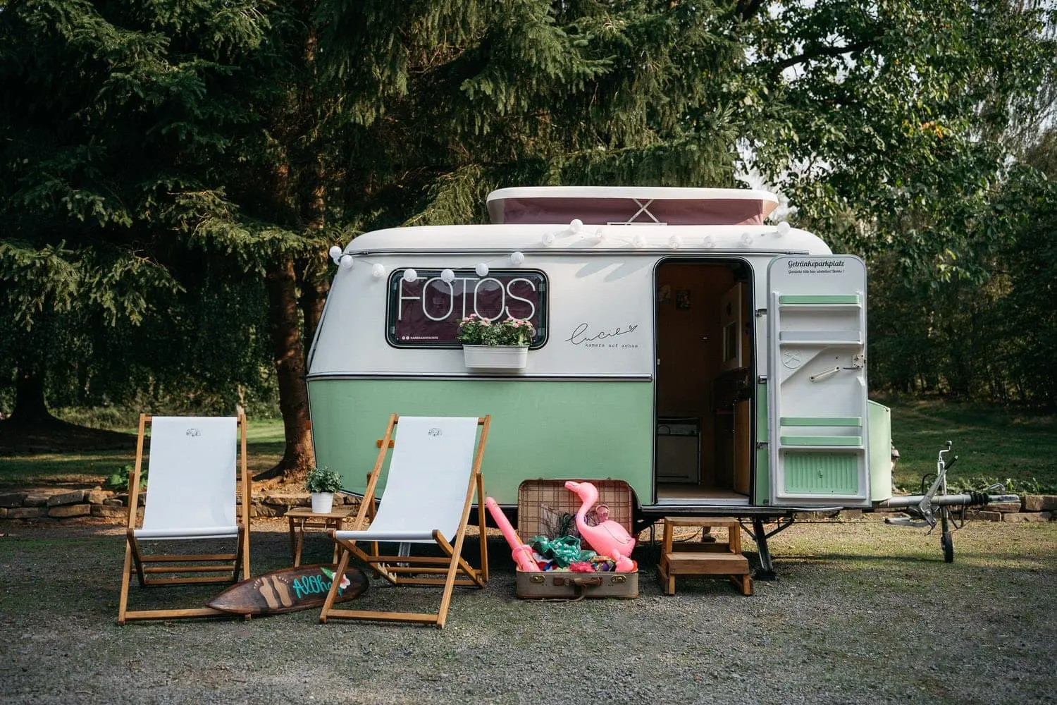Irgendwann kam uns eine Idee. Warum nicht die Photobooth selbst zum Highlight machen? Also nicht bloß als Mittel zum Zweck für witzige Erinnerungsfotos, sondern gleich noch eine Art „Showact“, einen Hingucker mit dazu liefern. So kamen wir auf die „Kamera auf Achse“ und schon begann die Suche nach dem perfekten Wohnwagen: Mit ganz viel Retrocharme und doch bestens erhalten, nicht zu groß und doch ausreichend geräumig. Sie können sich kaum unser breites Grinsen vorstellen, als wir unseren süßen Hymer Eriba Pan mit Baujahr 1978 von einem echten Liebhaber im bergischen Land abholen konnten. Nach langer Planung, Restaurierung und einem stilechten Makeover war unser Wohnwagen mit eingebauter Photobooth bereit für seinen ersten Einsatz.